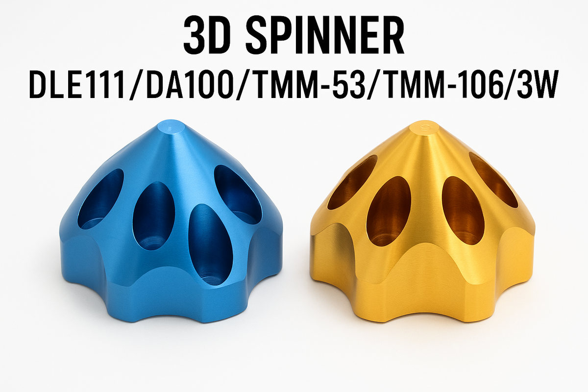 Upgrade your gas engine performance and style with this precision-CNC machined 3D Aluminum Spinner, engineered for perfect compatibility with DLE111, DA100, TMM-53, TMM-106, and 3W engines. Designed for strength, balance, and airflow efficiency, this spinner features a lightweight vented 3D cutout design that reduces rotating mass while improving cooling around the prop hub.