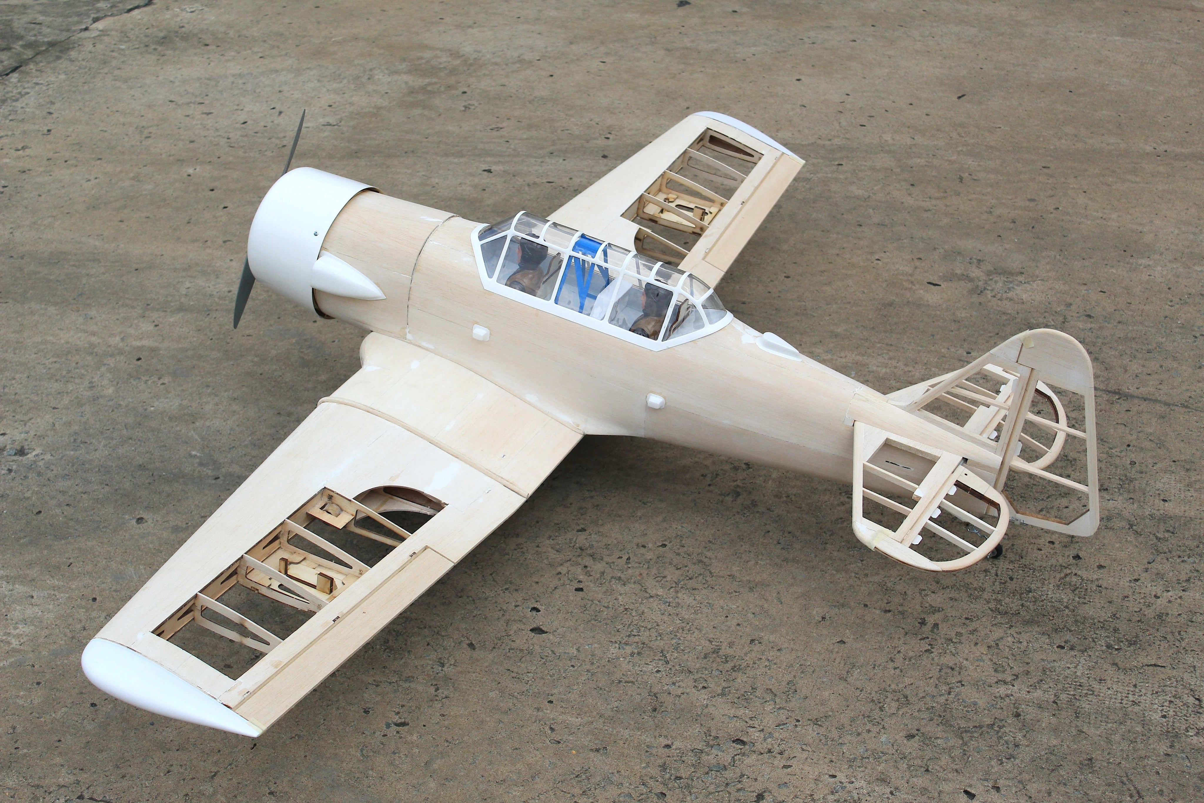 Construction is of light plywood and balsa sheet laser cutting, white pre-painted fiberglass cowl, wheel paints, cockpit, instrument panels and two pilots. All the hardware you need can be found in the box also. Fuel tank, wheels, tail wheel assembly, prebuilt pushrods, and tools for building your own airplane.