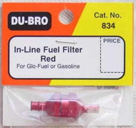 This is the DuBro In-Line Fuel Filter in Red anodize. Constructed of two threaded aluminum parts which separate for ease in cleaning. Includes a 130 micron mesh screen filter to filter out the smallest particles and an 0-ring to properly seal against leakage.