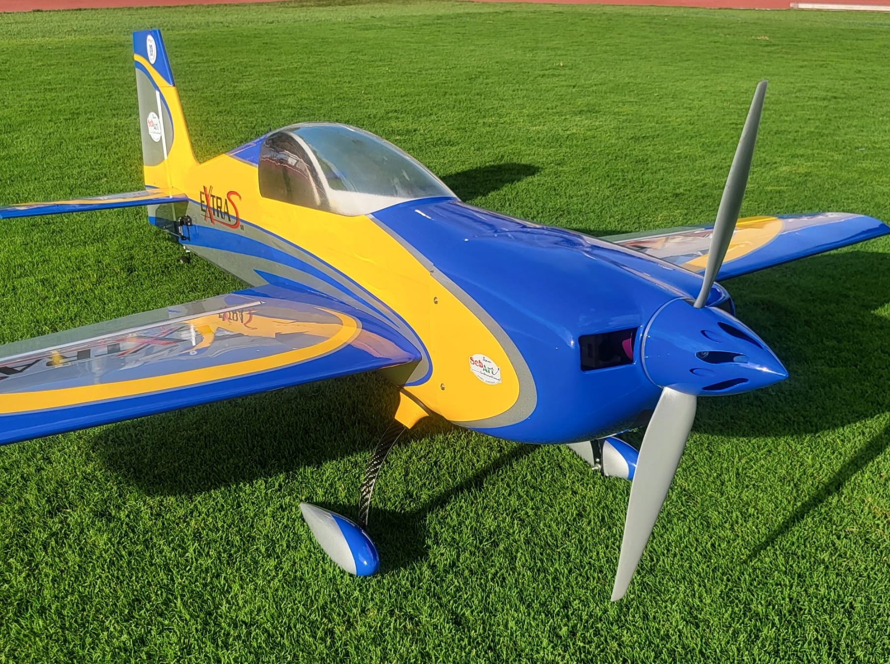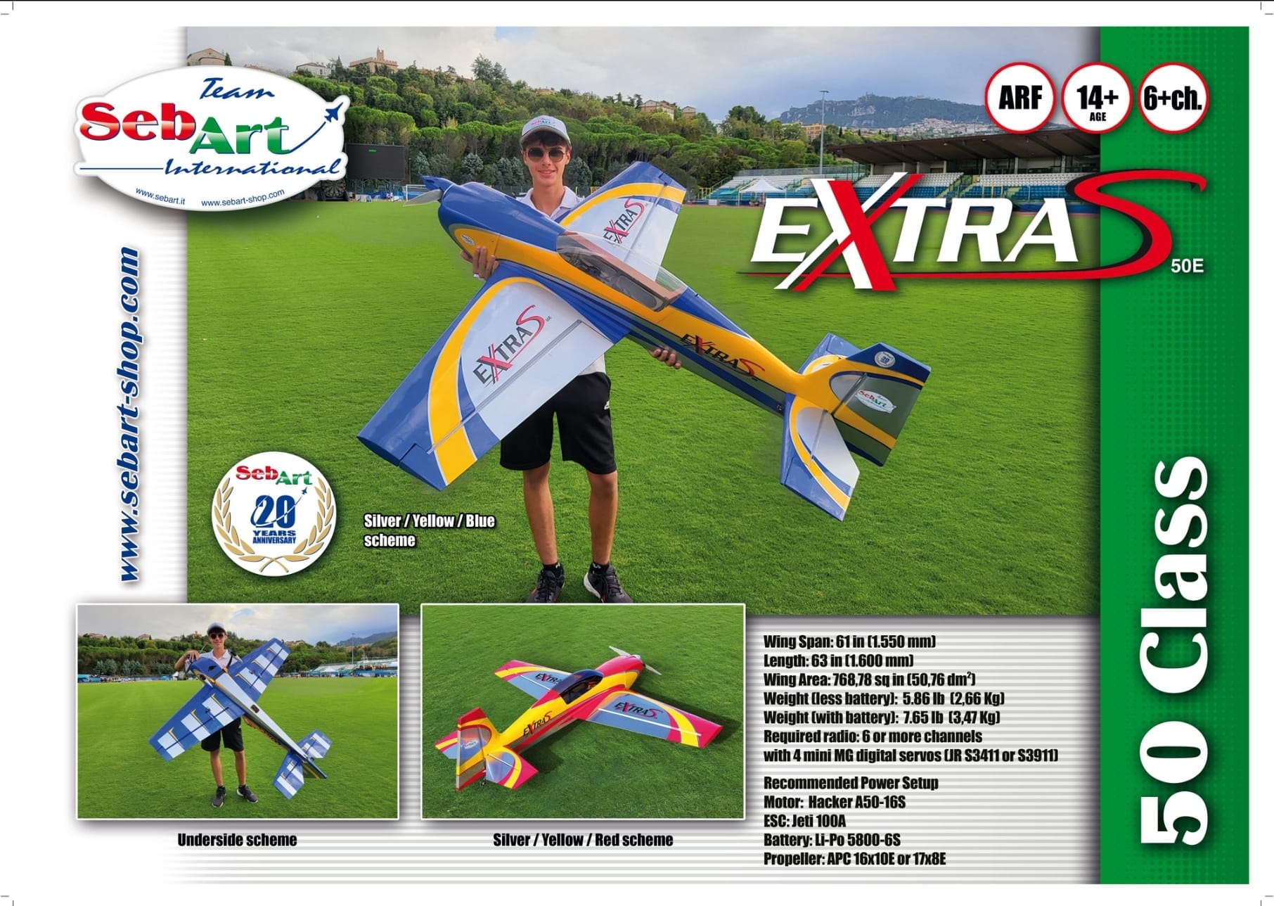 The new Extra XS 50E ARF was designed by the F3A aerobatic pilot Sebastiano Silvestri and it’s a semi scale version of the real plane Extra. This innovative design combined with the extremely lightweight structure all wood airframe, give the Extra XS ARF an impressive precision and smoothness at any airspeed and flight condition and at the same time in high rate mode and impressive agility.
