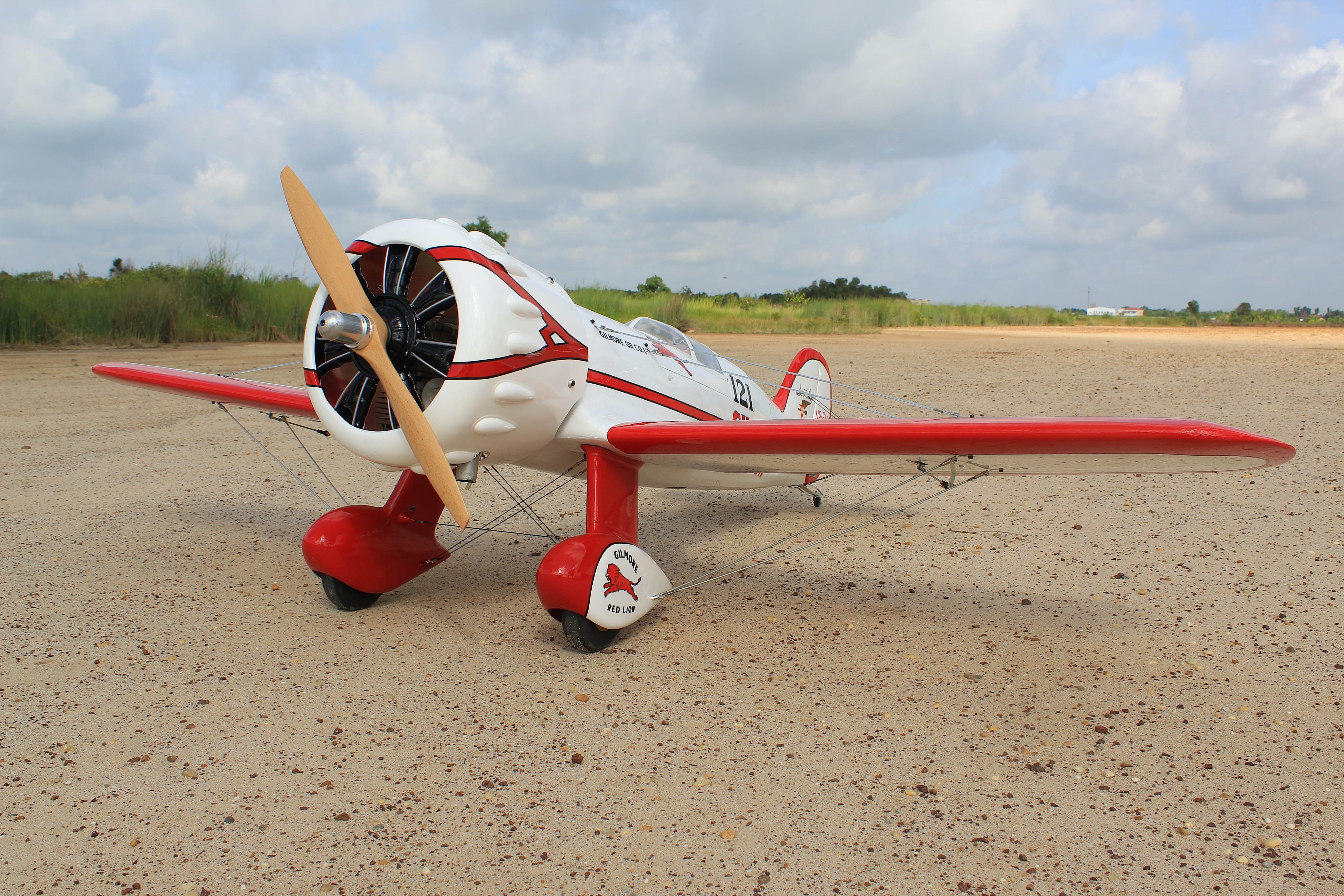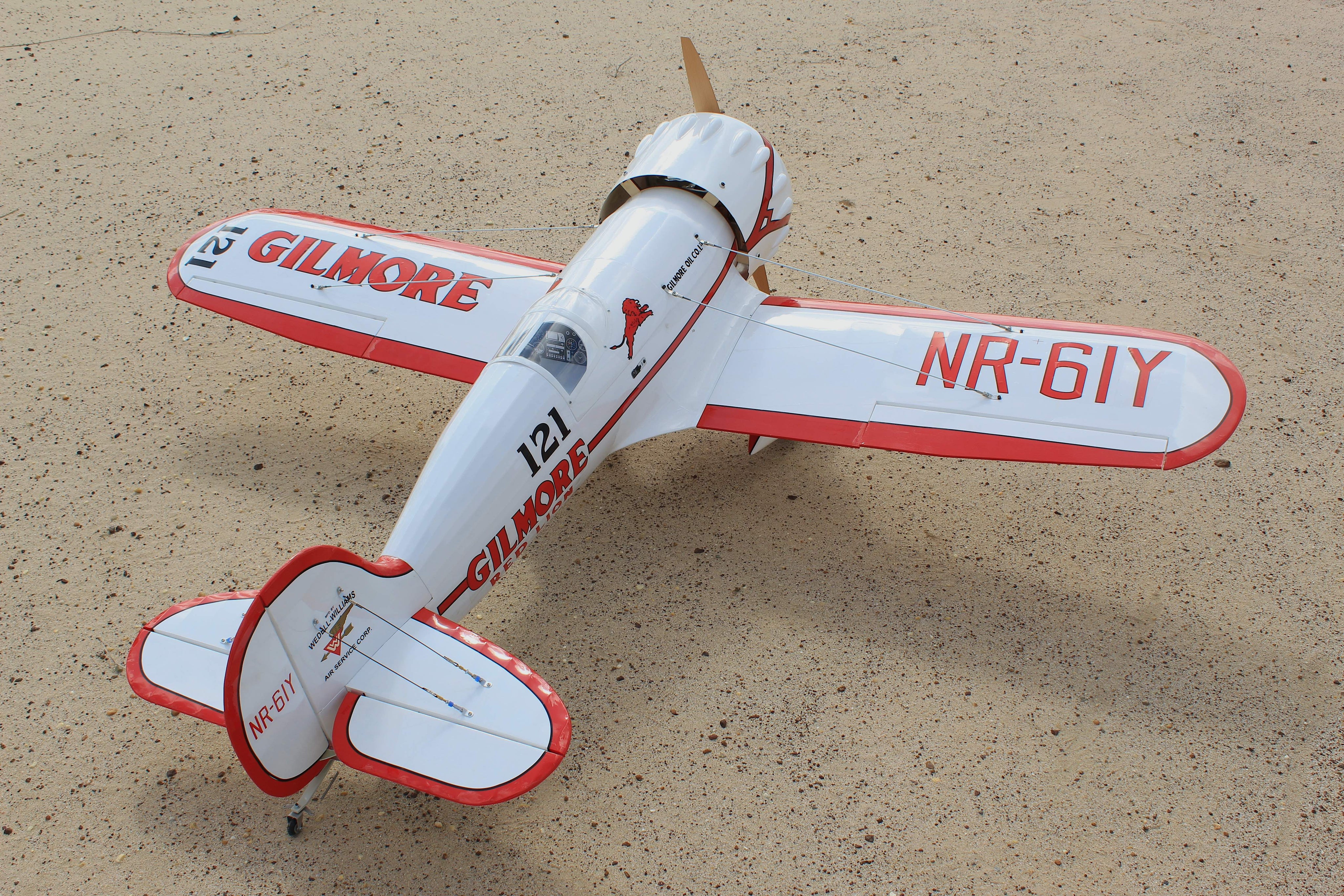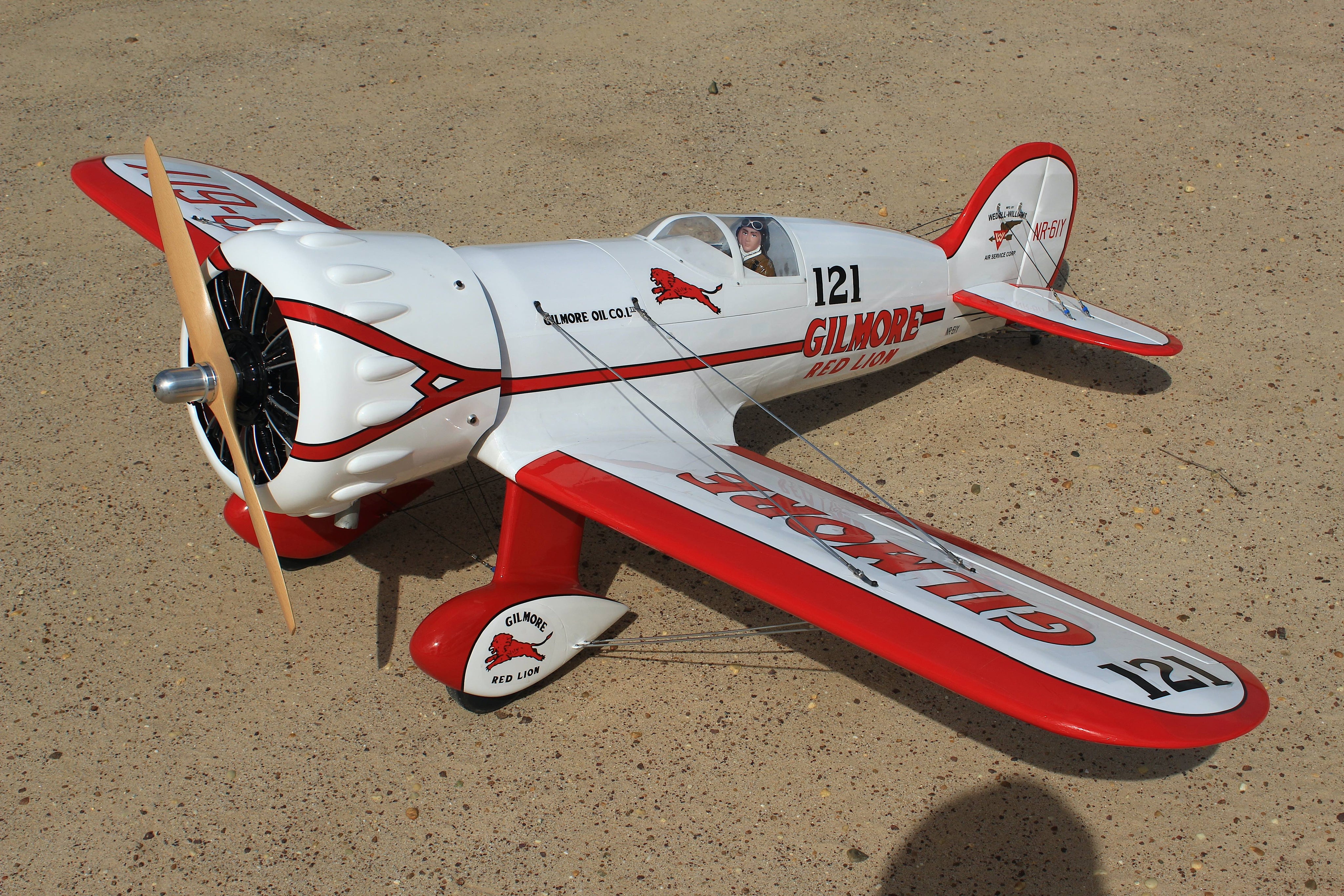 The Wedell Williams No.44 air racer (to give it its correct title) was one of the stars of the US racing circuit in the early 1930's. Roscoe Turner's Gilmore Special was the third Model 44 present at the 1932 races, trimmed in red with the Gilmore Oil Company logos and race number 121 displayed on the the fuselage. Turner placed 3rd in the Bendix and Shell Dash races but returned in 1933 with a re-powered '44 to win both.
