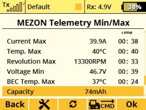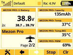 The Duplex EX telemetry system in the Mezon EVO lets you, monitor, in real-time the Amperage (Amp), Voltage (V), and Capacity (mAh) consumed by the battery, ESC even calculates Power (W) output of the system.