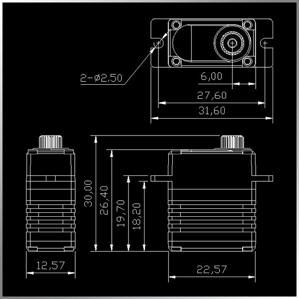 Finally an 18-gram Micro servo with a full 25-tooth 6MM output spline that is well suited for the Elevator servos on any F3A Pattern plane. Tested and works great at incredible savings!!!!