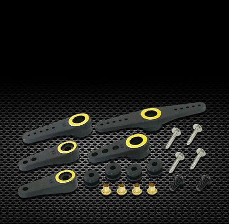 Use conventional 25 tooth 6MM Futaba style servo arms.