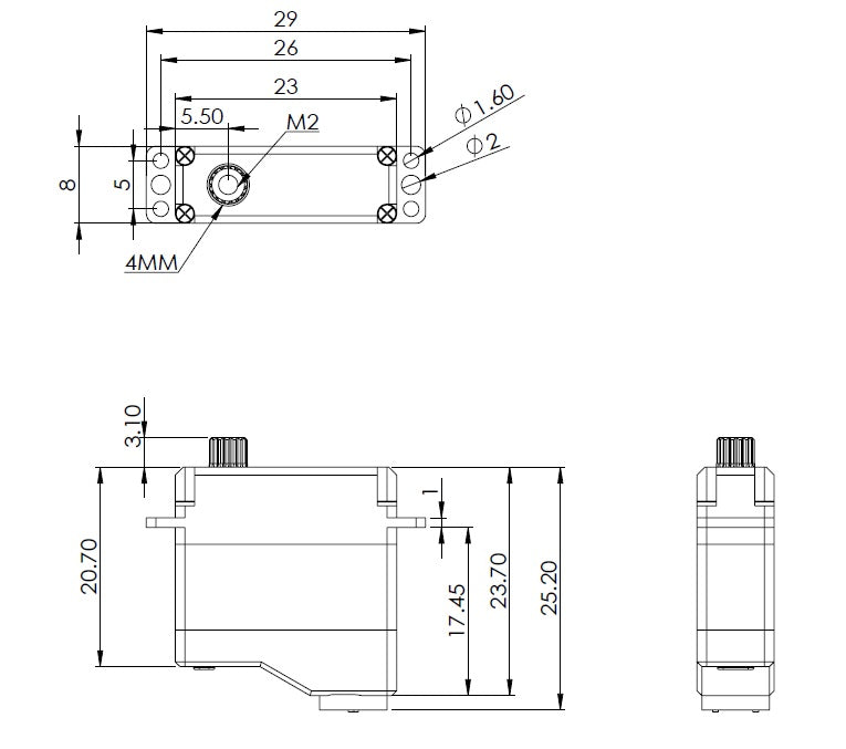 Note: The output spline gear size is 4MM. We sell a compatible Aluminum servos arm that fits this servo.