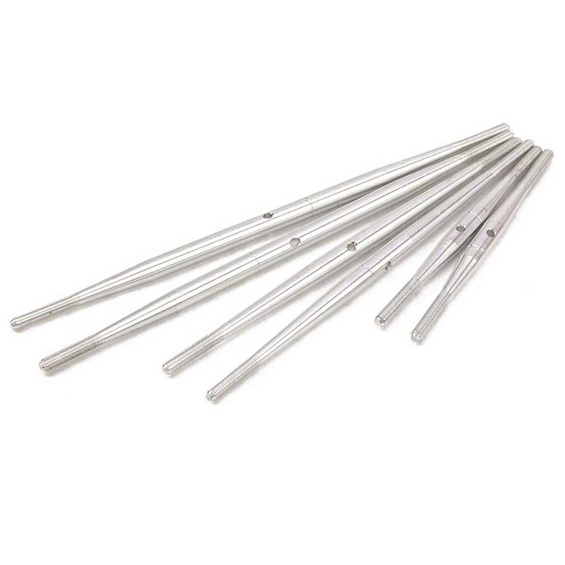 Each Pushrod features a 3mm right-hand thread on one side and a 3mm left-hand thread on the other (turnbuckle). A machined hole in the middle allows you to make very fine length adjustments without removing the linkage from the servo arm or control horn.
