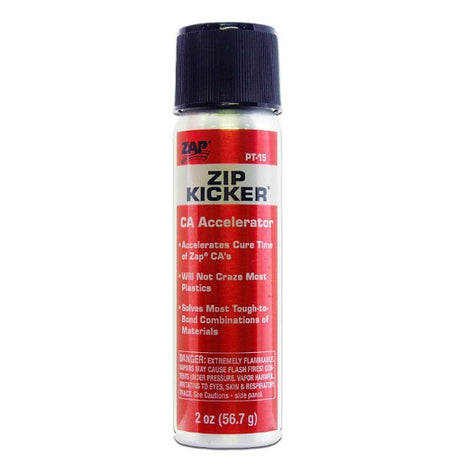 A little goes a long way! Because ZIP KICKER cures CA glue by a chemical reaction, you can precisely control how fast the glue sets up. Use a small amount to start the reaction at one spot and it will continue until the glue is set. The more ZIP KICKER you apply to the glue, the faster it will cure. Once the entire surface of the glue has been sprayed with kicker and the reaction has started, adding more kicker will not speed up the cure rate. In hard to reach areas or when trying to join parts that are not porous you can pre-treat one of the parts to be joined with ZIP KICKER, apply ZAP GLUE to the other and join the two together. When working with balsa wood spraying ZIP KICKER on the back side of thin sheeting can set the CA underneath. Even a part treated with ZIP KICKER and allowed to dry will speed the cure time of any CA that comes in contact with it.DO NOT SPRAY ZIP KICKER AROUND YOUR BOTTLES OF CA,A SMALL AMOUNT OF KICKER ON THE OPENING OF YOUR CA BOTTLE CAN AND WILL SET OFF AND HARDEN THE ENTIRE BOTTLE. Although ZIP KICKER will work on most materials and paints, always test on samples for compatibility. For critical applications test sample joints for the designed strength requirements.